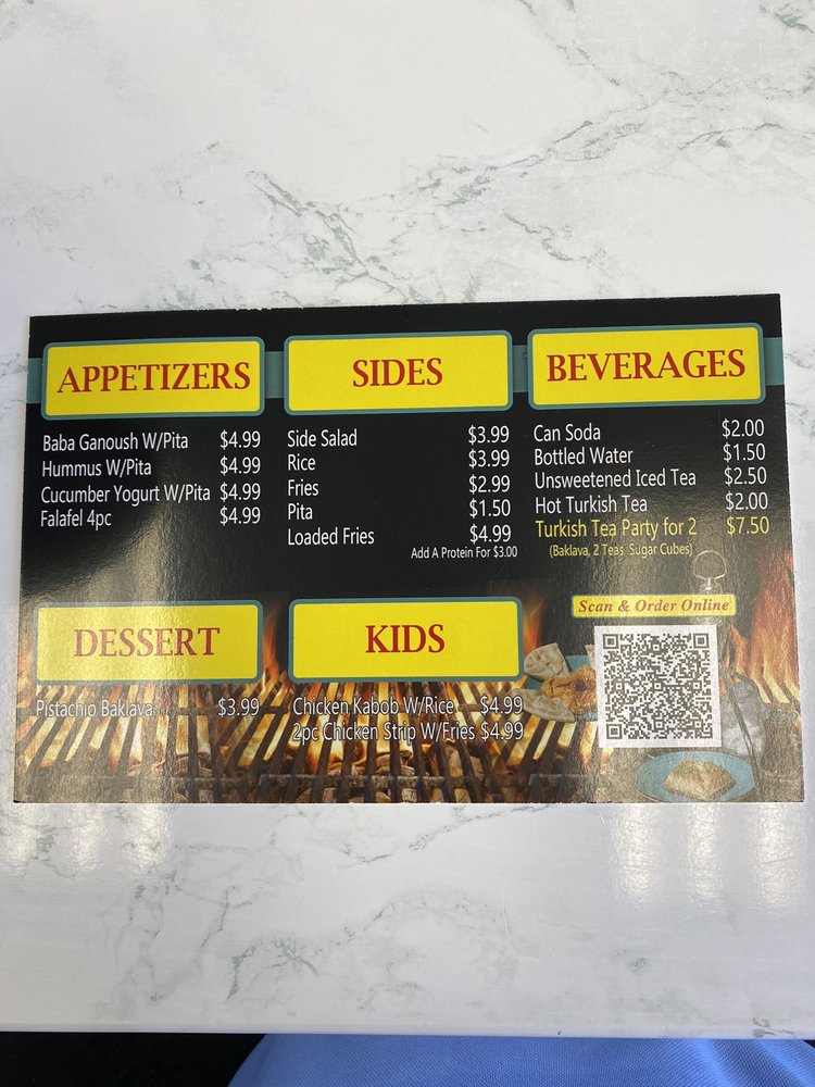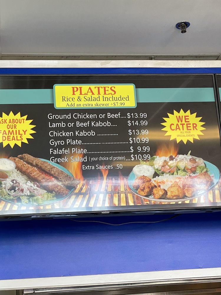 Ground beef or chicken skewer with lettuce tomato onion and tzatziki.